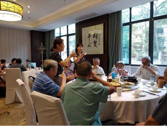 93岁、80多岁的老先生们,听说支部举办庆祝建国七十周年活动,即使行动不方便也要来参加。为了满足老先生们的心愿,支委专门安排人员接送各位老先生。参观活动结束后,大家欢聚一堂一起用餐。