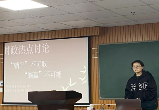第四组由王欣怡同志进行分享,该小组讨论主题是疫情防控。以美国抗疫的躺平做法所引发的后果和我国疫情的严峻形势得出躺平不可取,躺赢不可能的结论,之后讨论了二十大所提出的二十条,最后进行总结。
