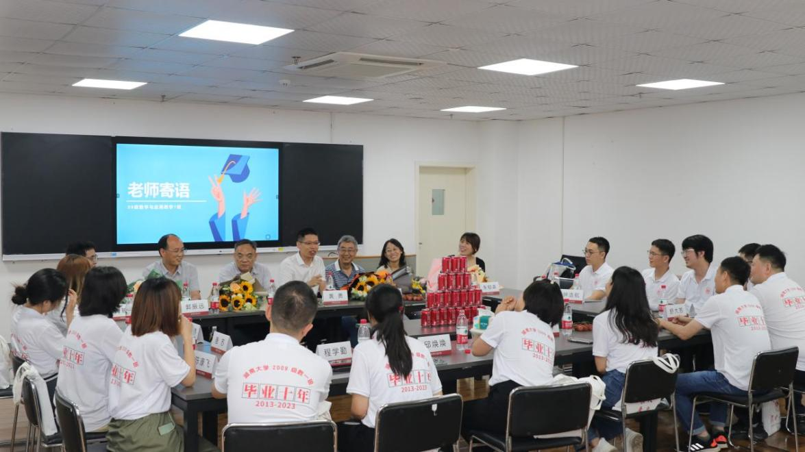 8月19日至20日周末,信息与计算科学2008级2班的同学回到母校举行了入学15周年的“共忆如歌青春”聚会活动。去年他们原本商量好组织毕业十周年纪念活动,因为疫情原因而未能成行。19日下午,他们来到今年会jinnianhuicom425会议室,与老师们一起欢聚一堂,座谈交流,回忆大学的学习和生活,副院长雷渊以及宋怀玲、罗汉、朱郁森、姚兰、蔡明杰等当年的任课老师应邀出席了座谈会,425还开通了视频会议,在深圳出差和在国外不能前来的校友,也在线上参加了座谈。