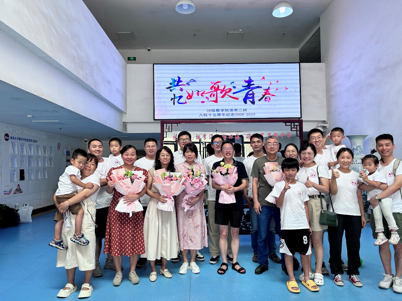 雷院长回忆起自己当年刚毕业就教授08级的高等代数课程,对同学们印象深刻。老师和同学纷纷说起当年的课堂、当年的考试,谈论同学之间、师生之间的往事,历历在目,如数家珍。校友们还各自介绍了毕业后的工作情况、家庭情况。大家还说到当年班上转专业的同学在年级中最多,在座的就有好几个,但他们强调,虽然去了别的院系,和信息班同学的友谊却是最深厚的。最后校友们向老师们送上鲜花,并和老师一起合影留念,表达对母校对老师的敬意。