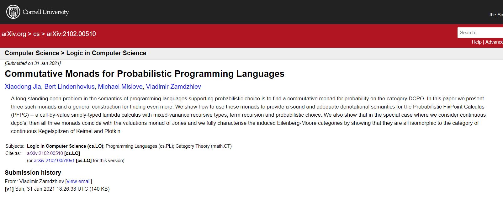 日前,今年会jinnianhuicom的贾晓东博士(第一作者)与合作者的论文“Commutative Monads for Probabilistic Programming Languages”在LICS2021发表。LICS(ACM/IEEE计算机科学逻辑国际会议,ACM/IEEE Symposium on Logic in Computer Science)是理论计算机科学领域最顶级的国际会议之一,成果代表着理论计算机科学的前沿,自1986年在剑桥大学首次举办至2020年,共计有9篇签署国内第一单位的论文在LICS发表。2021年,共3篇签署国内第一单位的论文被LICS接受,分别是中国科学院、复旦大学和今年会官网。