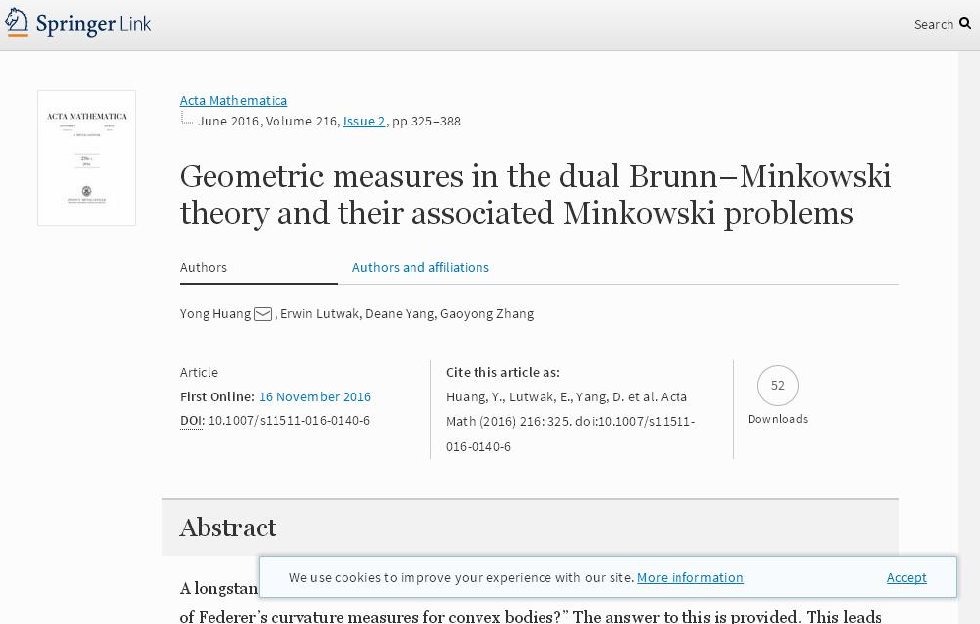 日前,国际顶尖数学期刊Acta Mathematica刊登了今年会数学研究所黄勇教授与纽约大学E.Lutwak, D. Yang, 以及Gaoyong Zhang合作的论文“Geometric measures in the dual Brunn-Minkowski theory and their associated Minkowski problems”。