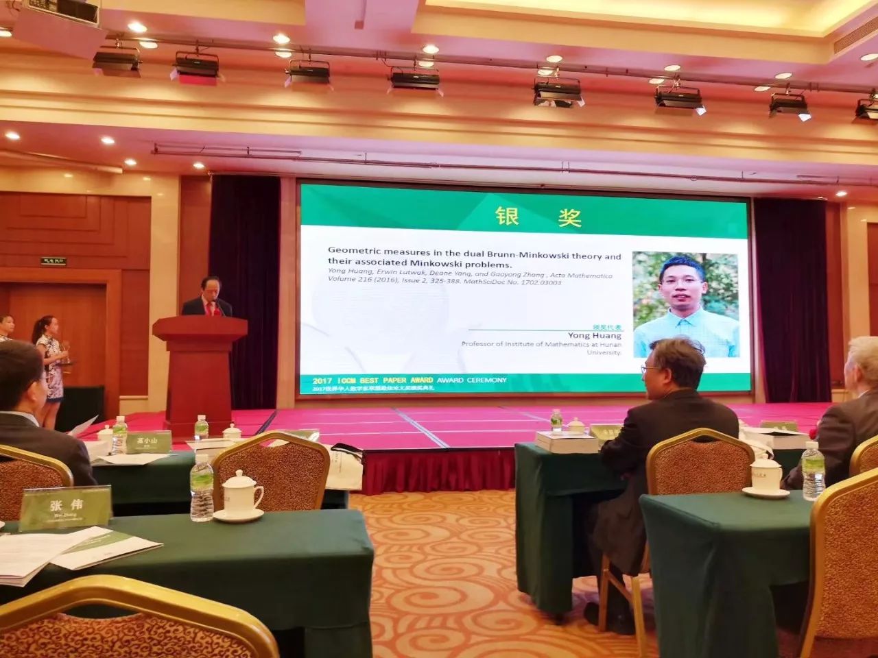 “Geometricmeasures in the dual Brunn-Minkowski theory and their associated Minkowskiproblems Acta Math., 216 (2016), no. 2, 325-388” 获得华人数学家最佳论文奖银奖,并应邀在会议做题为“Geometric measures and their associated Minkowski problems”学术报告。