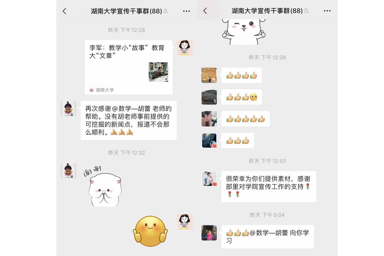 胡蕾想,宣传思想工作要从做好人的工作找到落脚点,要从讲好身边人的故事做起。于是,她用心在日常与师生的交流沟通中搜集素材。她在一次关于写作技巧的聊天中了解到了“淡泊名利,诲人不倦”的杨必中老师;她在从事组织干事工作时,知道了54岁的民主党派人士汪端阳老师积极加入中国共产党的事迹;她在担任工会福利委员时,熟悉了身患癌症,“把每节课当做最后一节课”上的马传秀老师;她在与老师的日常交流中,了解了甘坐冷板凳,矢志于原创性研究的周泽老师;她在学生的朋友圈中知晓了“酿制1700小时夜间课堂”的李军老师······因为用心,所以能挖掘典型事迹,找到工作重点。因为用情,所以能得到老师们的积极支持。