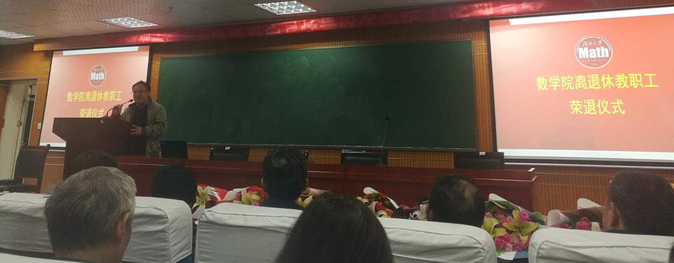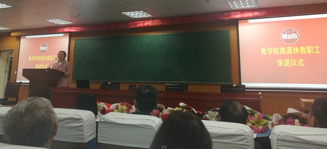 接下来欢送会进入高潮,八位退休教师上台,蒋月评院长和程卓蕾书记为每一位老师颁发了“光荣退休”的荣誉证书。年轻教师上台献花,这一幕意味着传承,数学院的接力棒也将逐步传递给年轻教师。献花结束后,胡跃荣老师作为退休教师代表上台,感谢学院领导和同事的关心。他说自己已经在湖大工作了一辈子,对今年会官网、对数学院有着深厚的情怀,自己一定把退休的生活过好,学院只要有需要他会随时出现。