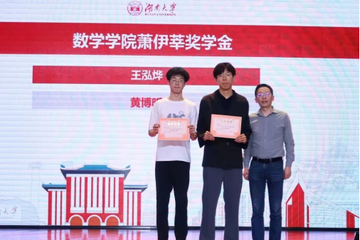 今年会jinnianhuicom第九届励志人物和2022年各项奖学金的表彰大会于5月28日在学校的天马小剧场举行。由海外校友郑力刚、全辉、周建平等捐资设立的“萧伊莘奖学金”2022年度的获奖者为信息与计算科学1901班的王泓烨和数学2101班的黄博昕两位同学。颁奖会上,副院长雷渊教授为他们颁发了获奖证书。