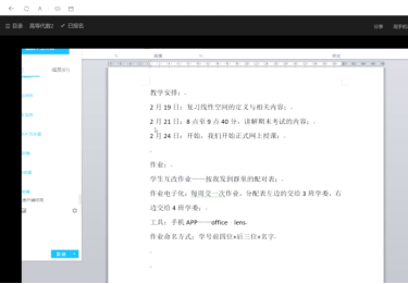 确定授课方案之后,老师将提交给学院的授课方案、课程教材以及参考书的电子版放到课程 QQ 群里供学生使用。从试讲课开始,每次上课的讲义,补充习题课的讲义都在课后上传到课程 QQ 群。此外,两位老师还比较了网络上现有的大部分《高等代数》视频资源,发现谢启鸿教授在复旦大学的课程和丘维声教授在清华大学的课程是质量最好的两种,因为教材选择和课程内容安排的原因,不能直接拿来作为上课资源,于是推荐给学生观看,作为线上教学的补充。